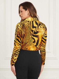GUESS נשים בגד גוף עם שרוולים ארוכים F8RV1252 לבוש הדפס שקיעה מוזהב