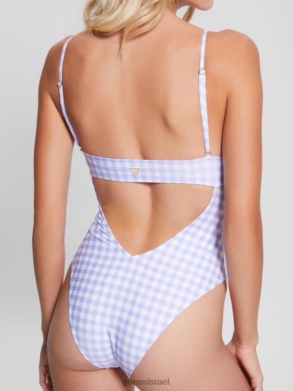 GUESS נשים בגד ים אקו ג’ינגהם מחלק אחד F8RV2550 לבוש לבנדר לבן קטן ויש