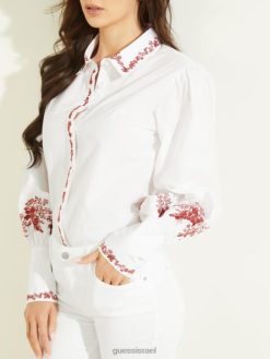 GUESS נשים חולצה רקומה ravin F8RV1430 לבוש לבן טהור