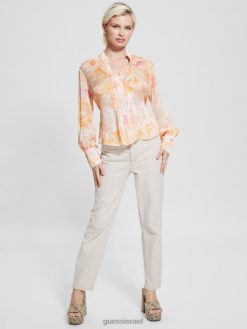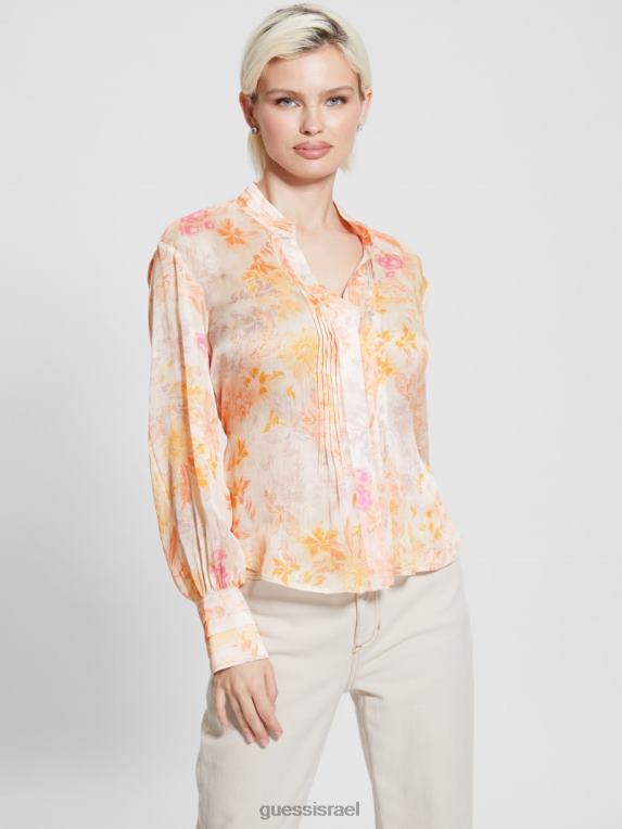 GUESS נשים חלק עליון אקו מוניקה שיפון עם שרוולים ארוכים F8RV1122 לבוש פריחת מנדרינה