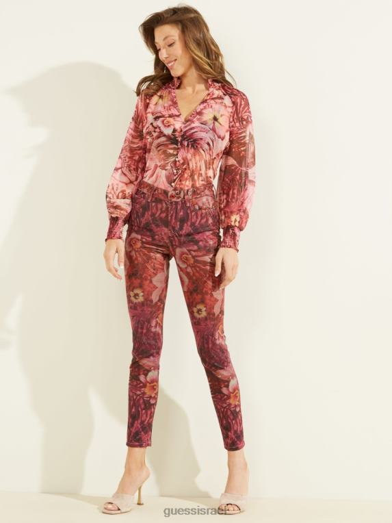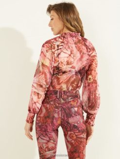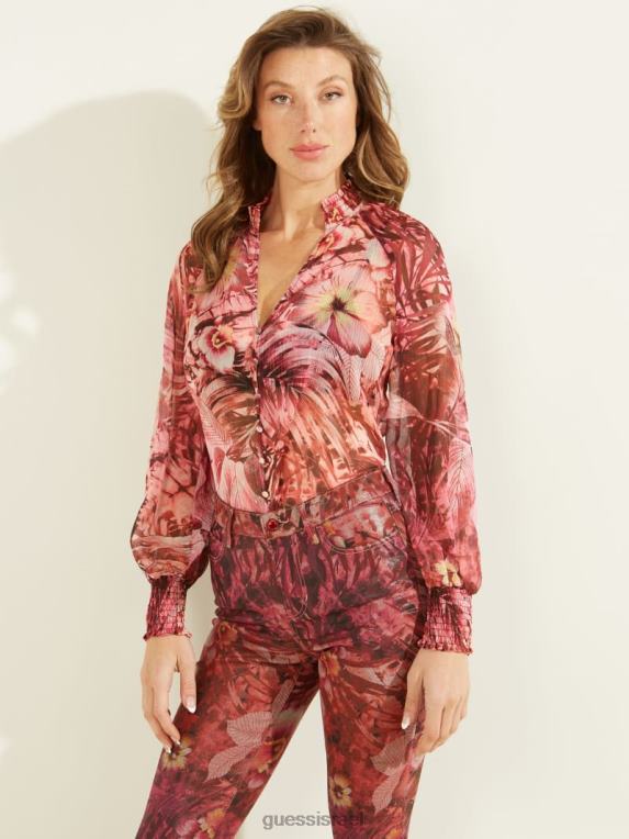 GUESS נשים טופ צ’רלי אקולוגי F8RV1639 לבוש הדפס טרופי בטיק ורוד