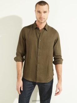 GUESS גברים חולצת פשתן של eco island F8RV4114 לבוש קנטינה ירוקה