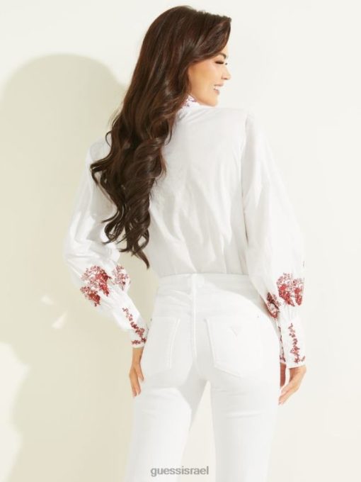 GUESS נשים חולצה רקומה ravin F8RV1430 לבוש לבן טהור