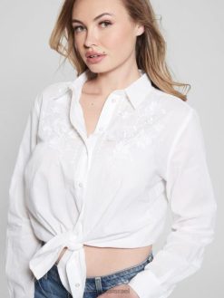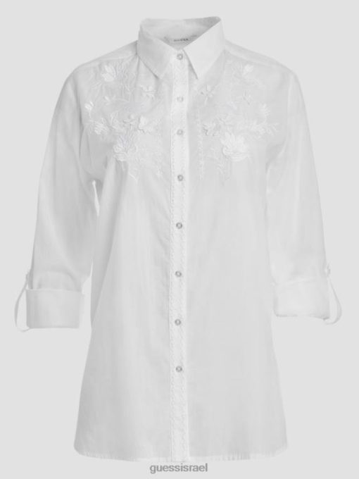 GUESS נשים חולצת כותנה רקומה של נאדיה F8RV1165 לבוש לבן טהור