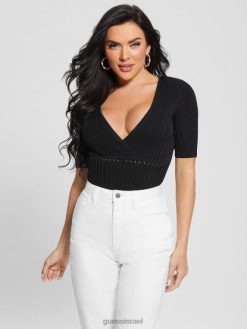 GUESS נשים חלק עליון עם צווארון V עם תחבושת רכה F8RV1008 לבוש שָׁחוֹר
