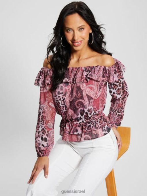 GUESS נשים טופ לוסי אקולוגי מחוץ לכתף F8RV1046 לבוש הדפס קשמיר סגול