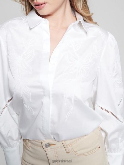 GUESS נשים לורי חולצה ארוגה רקומה F8RV1055 לבוש לבן טהור