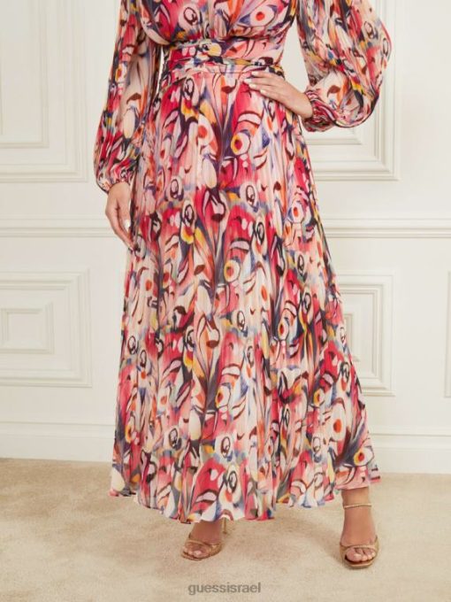 GUESS נשים שמלת מקסי קפלים של Wonderland F8RV559 לבוש הדפס ארץ הפלאות