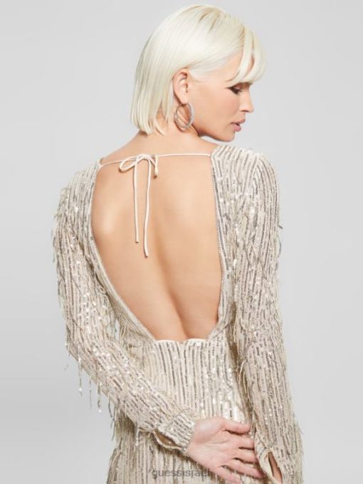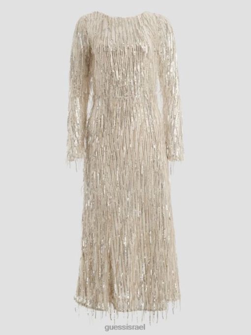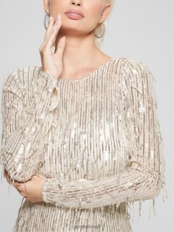 GUESS נשים שמלת שוליים נצנצים של elodie F8RV737 לבוש מולטי אוף לבן